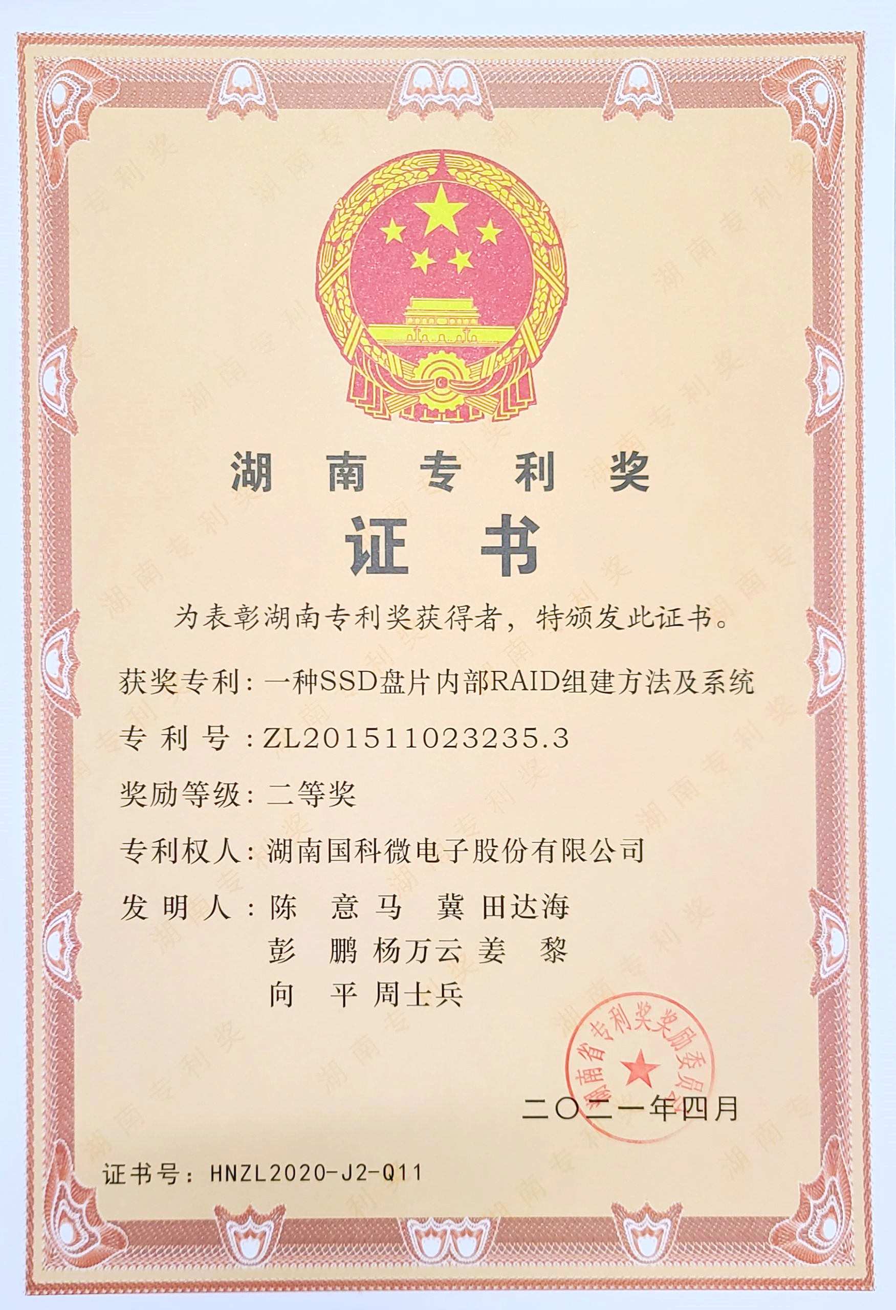 湖南專利獎證書