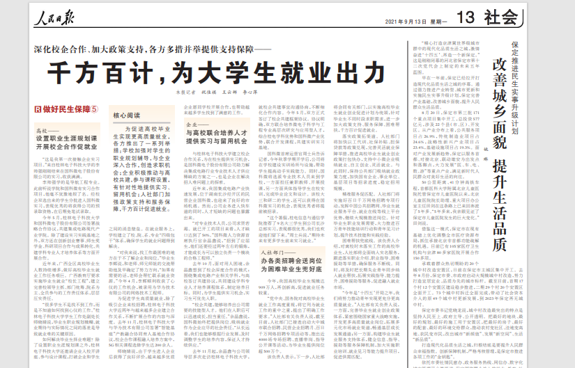深化校企合作、加大政策支持,各方多措并舉提供支持保障—— 千方百計(jì),為大學(xué)生就業(yè)出力 (做好民生保障⑤) 本報(bào)記者  祝佳祺  王云娜  李心萍 《人民日?qǐng)?bào)》(  2021年09月13日   第 13版)   核心閱讀   為促進(jìn)高校畢業(yè)生實(shí)現(xiàn)更高質(zhì)量就業(yè),各方推出了一系列舉措:學(xué)校加強(qiáng)對(duì)學(xué)生的職業(yè)規(guī)劃輔導(dǎo),與企業(yè)深入合作,創(chuàng)造求職機(jī)會(huì);企業(yè)積極推動(dòng)與高校共建,參與課程設(shè)置,有針對(duì)性地提供實(shí)習(xí)、留用機(jī)會(huì);人社部門加強(qiáng)政策支...
